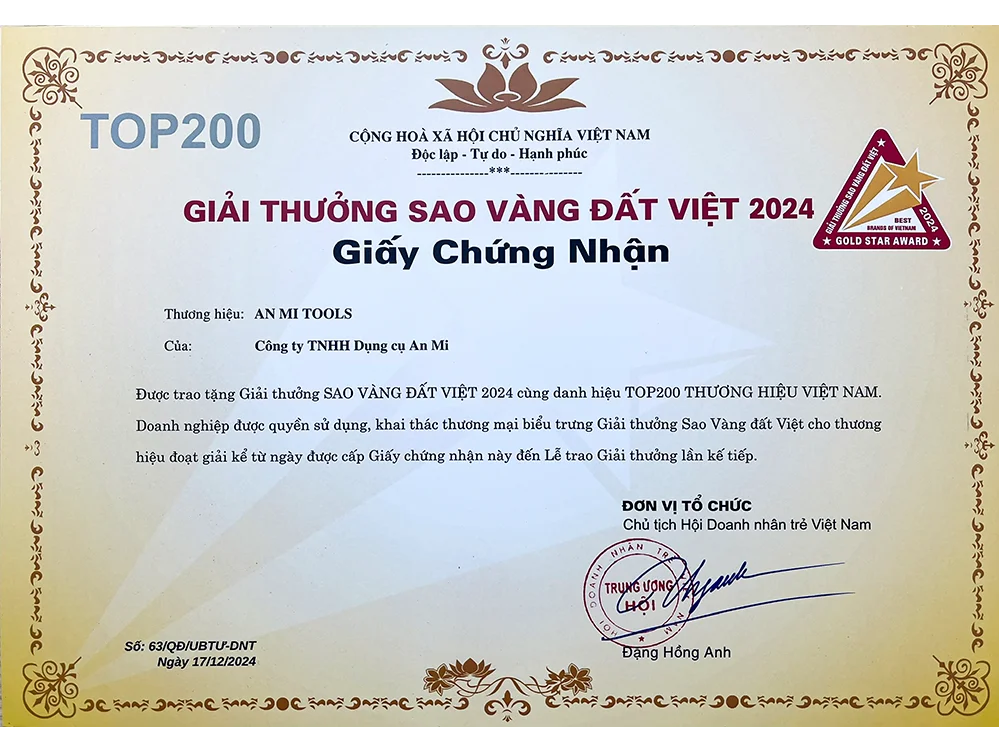 Công ty TNHH Dụng Cụ An Mi được trao Giấy Chứng Nhận Sao Vàng Đất Việt 2024 trong TOP200 thương hiệu tiêu biểu, khẳng định uy tín thương hiệu và chất lượng sản phẩm trên thị trường quốc gia.