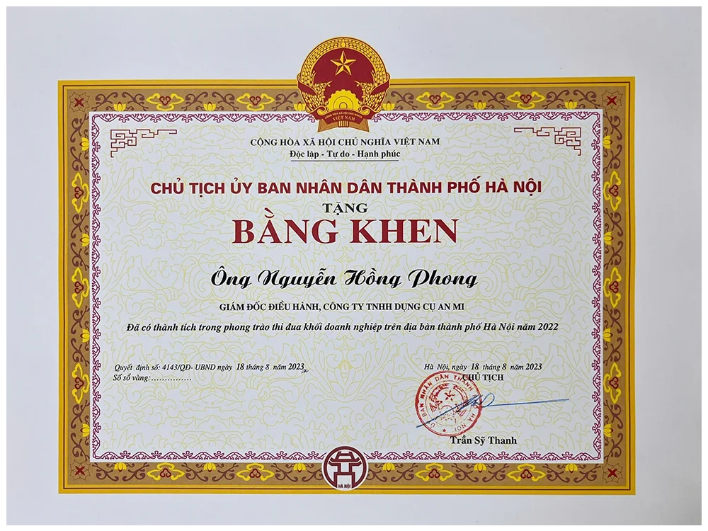 Khen thưởng Ông Nguyễn Hồng Phong — Giám đốc Điều hành Công ty TNHH Dụng Cụ An Mi — vì những thành tích xuất sắc trong sản xuất kinh doanh, góp phần thúc đẩy phát triển kinh tế — xã hội của Hà Nội năm 2022.