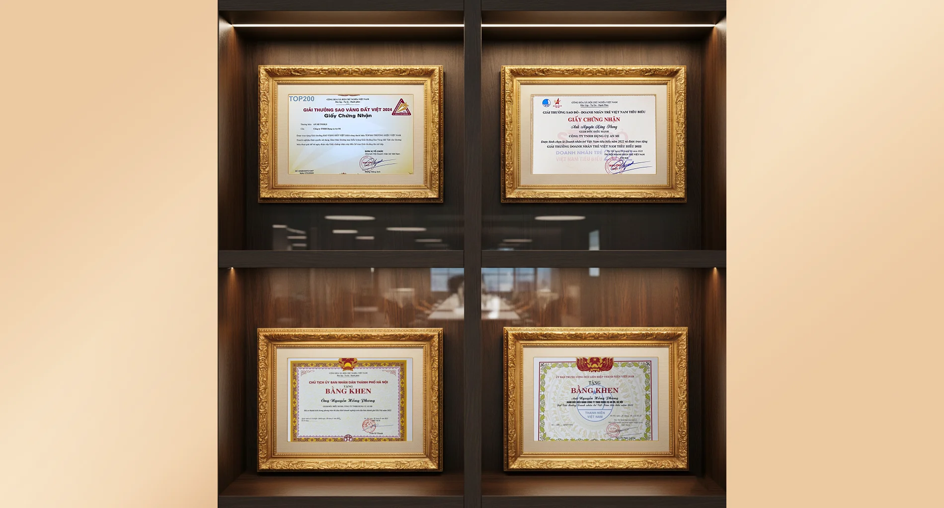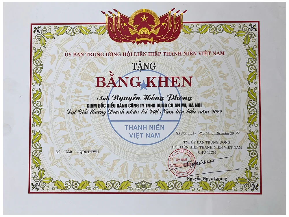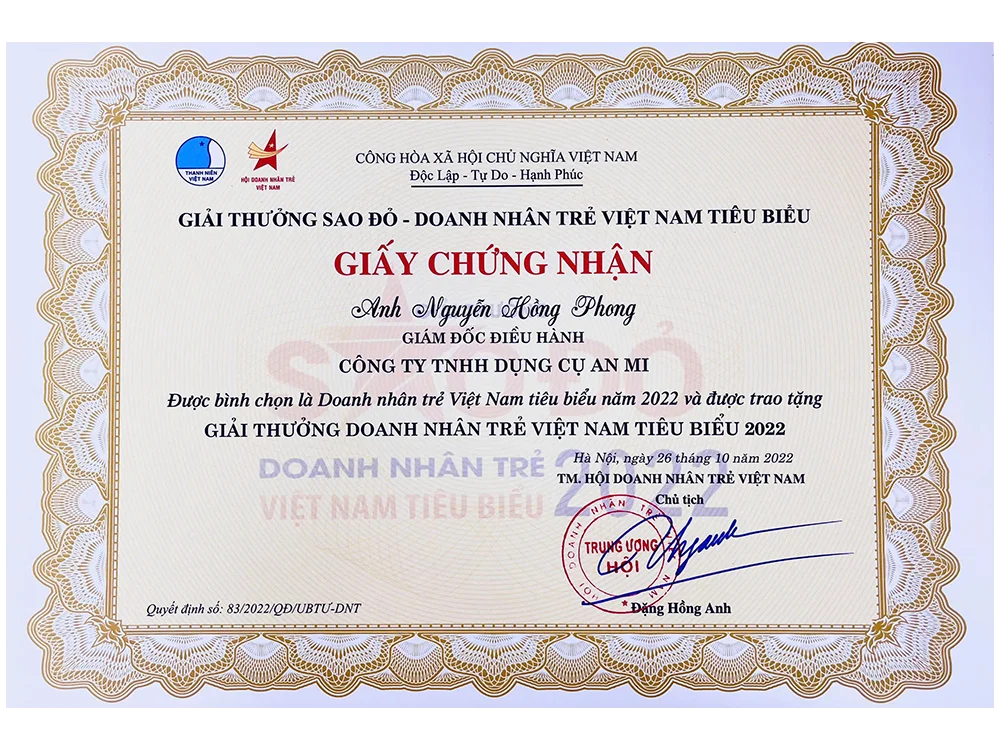 Khen thưởng Anh Nguyễn Hồng Phong — Giám đốc Điều hành Công ty TNHH Dụng Cụ An Mi, Hà Nội — đạt giải thưởng Doanh nhân trẻ Việt Nam Tiêu Biểu năm 2022, ghi nhận đóng góp nổi bật của thanh niên trong cộng đồng và doanh nghiệp.