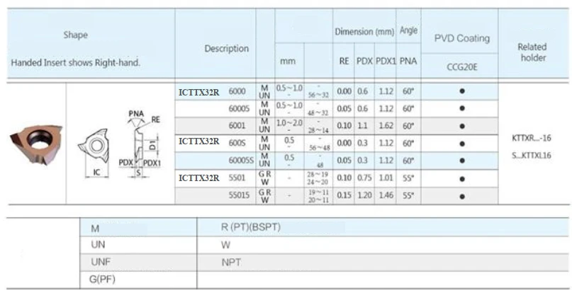 - Góc ren 11°, các thông số: RE, PDX, PDX1 theo mã cụ thể.