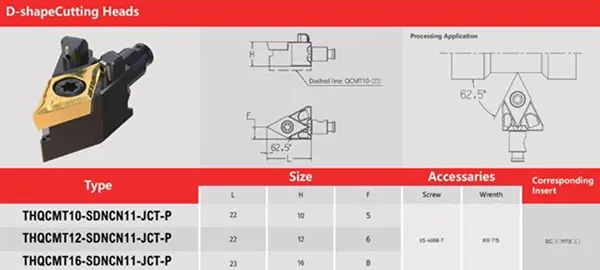 THOCMT-SDNCN-JCT-P là dòng đầu dao phay hình chữ D, phù hợp cho các ứng dụng gia công chính xác như rãnh, vát mép hoặc cắt biên. Thiết kế liền khối giúp tăng độ ổn định khi gia công, giảm thiểu rung động và kéo dài tuổi thọ dao. Hậu tố JCT cho biết sản phẩm có kênh làm mát bên trong, hỗ trợ hiệu quả trong quá trình cắt tốc độ cao. Góc cắt theo minh hoạ là 62.5°, đảm bảo khả năng thoát phoi tốt và bề mặt hoàn thiện cao.