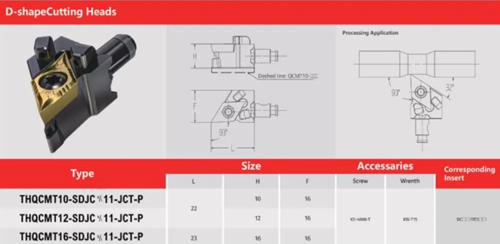 THQCMT-SDJC-JCT-P là dòng đầu dao phay hình chữ D, phù hợp cho các ứng dụng gia công chính xác như rãnh, vát mép hoặc cắt biên. Thiết kế liền khối giúp tăng độ ổn định khi gia công, giảm thiểu rung động và cải thiện chất lượng bề mặt. Góc cắt theo bản vẽ kỹ thuật là 93°/37°, hỗ trợ khả năng thoát phoi tốt và hoàn thiện bề mặt cao. Hậu tố JCT cho biết sản phẩm có kênh làm mát bên trong, giúp tăng hiệu quả khi gia công tốc độ cao.