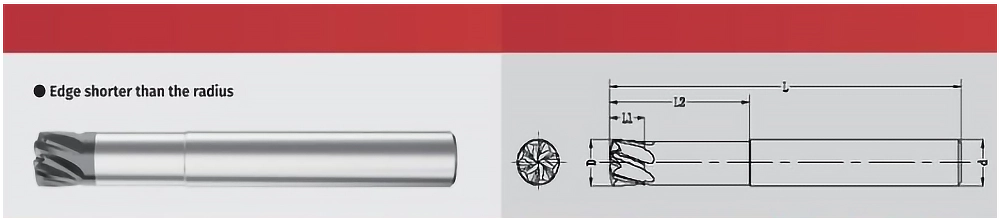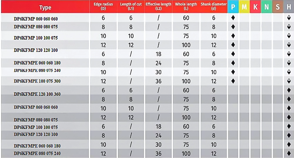 Dòng dao phay DP6KMP được chế tạo từ hợp kim nguyên khối chất lượng cao, tối ưu cho các ứng dụng gia công yêu cầu độ chính xác và độ bền cao. Thiết kế Edge shorter than radius giúp giảm lực cắt, hạn chế mẻ lưỡi và tăng tuổi thọ dao.