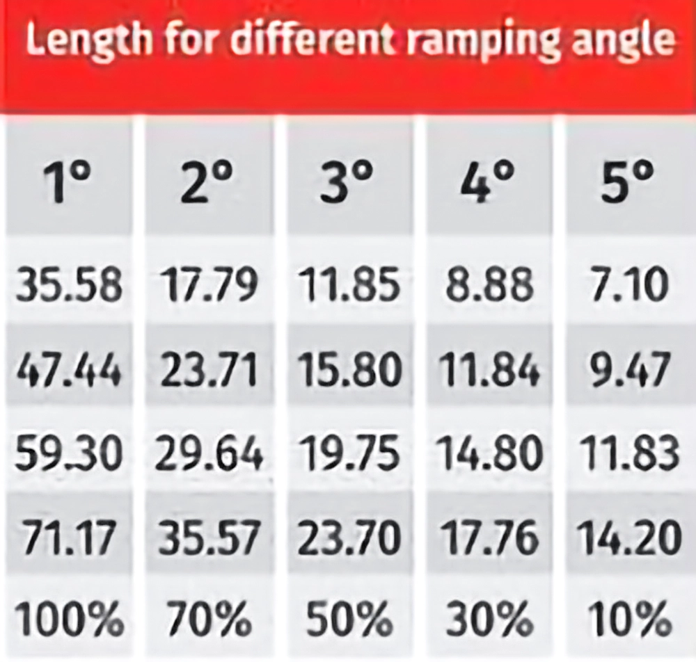 | Max. | Min. | % Incline | 1° | 2° | 3° | 4° | 5° | |||||||