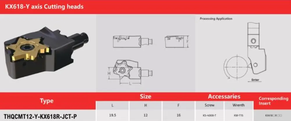 THQCMT12-Y-KX618R-JCT-P là dòng đầu dao phay chuẩn KX618, thiết kế theo trục Y và hướng cắt phải (R), phù hợp cho các ứng dụng gia công chính xác như rãnh, vát mép hoặc cắt biên. Cấu trúc liền khối giúp tăng độ ổn định khi gia công, giảm thiểu rung động và cải thiện chất lượng bề mặt. Hậu tố JCT cho biết sản phẩm có kênh làm mát bên trong, hỗ trợ hiệu quả trong quá trình cắt tốc độ cao. Insert tương ứng theo catalog là KX618□□□□, đảm bảo độ chính xác và khả năng thoát phoi tốt.