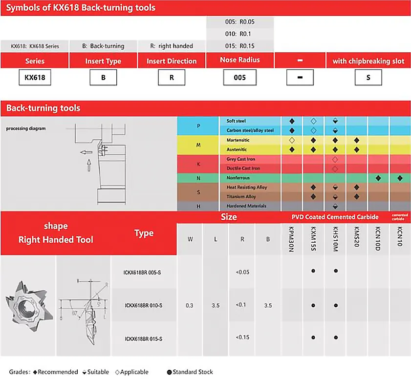 | Khuyến nghị cấp hạt PVD | Theo bảng ứng dụng: các cấp hạt được đánh dấu phù hợp cho từng nhóm vật liệu |