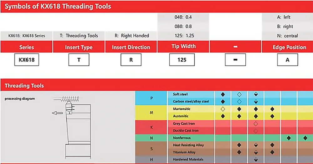 | Vật liệu gia công | P (Thép carbon, thép hợp kim), M (Thép martensitic, austenitic), K (Gang xám, gang cầu), N (Kim loại màu), S (Hợp kim chịu nhiệt, titan), H (Thép tôi cứng) |