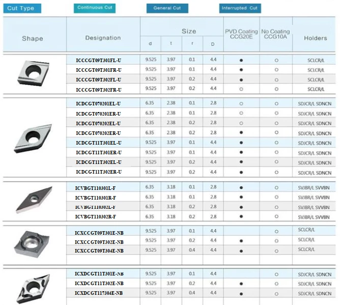 Thông số kỹ thuật các loại insert tiện và holder tương ứng